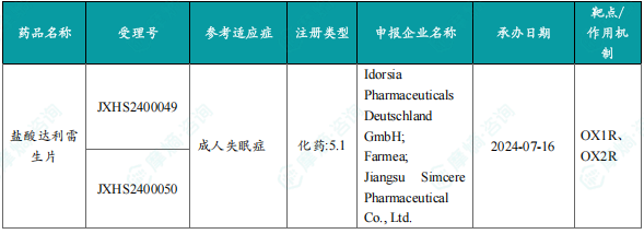 6月20日,国家药监局发布药品批准证明文件送达信息:先声药业的盐酸达利雷生片获批上市,适用于治疗成人失眠症,特别是那些表现为入睡困难和/或睡眠维持困难的患者。公开资料显示,盐酸达利雷生片是一种选择性双食欲素受体拮抗剂 (DORA),可等效抑制促觉醒大脑区域中的食欲素1和食欲素2受体,从而抵消失眠患者的大脑过度活跃状态并最终促进睡眠。