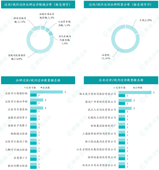 本周过评/视同过评品种主要为系统用抗感染药物;过评/视同过评产品剂型主要为注射剂;本周注射用头孢噻肟钠品种过评/视同过评数量最多达5个,本周各品种过评/视同过评企业均为1家;各企业过评/视同过评品种数均为1种,本周过评/视同过评企业共包括湘北威尔曼制药股份有限公司、海南广升誉制药有限公司和武汉久安药业有限公司等10家企业。