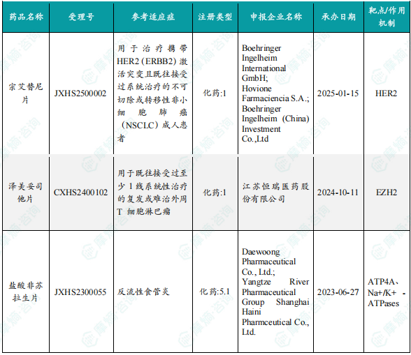 9月1日,国家药监局发布药品批准证明文件送达信息:勃林格殷格翰申报的1类创新药宗艾替尼片获批上市,适用于治疗存在HER2(ERBB2)激活突变且既往接受过至少一种系统治疗的不可切除的局部晚期或转移性非小细胞肺癌(NSCLC)成人患者。公开资料显示,宗艾替尼片是一款高选择性、共价结合的口服HER2酪氨酸激酶抑制剂(TKI),能高效且选择性地共价结合于HER2激酶结构域,强效抑制所有主要的HER2激活突变(包括经典的YVMA插入突变等),从而阻断下游致癌信号通路。还能巧妙规避野生型EGFR(wtEGFR)。江苏恒瑞医药股份有限公司申报的1类创新药泽美妥司他片获批上市,适用于既往接受过至少1线系统性治疗的复发或难治外周T细胞淋巴瘤成人患者。公开资料显示,该产品是中国首个自主研发的EZH2抑制剂,通过抑制组蛋白甲基转移酶EZH2,逆转肿瘤细胞的异常表观遗传编程。9月5日,扬子江药业引进的盐酸非苏拉生片获批上市,适用于反流性食管炎的治疗。公开资料显示,盐酸非苏拉生片是一款新型钾离子竞争性酸阻滞剂(P-CAB),能够可逆地阻断分泌胃酸的质子泵,治疗胃食管反流病,由韩国大熊制药株式会社研发,扬子江药业旗下海尼药业获得其在中国的研发和商业化权益。