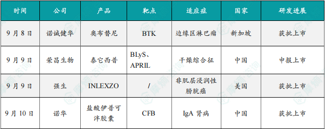 9月10日,诺华宣布全球首创靶向抑制补体旁路途径的口服补体B因子抑制剂盐酸伊普可泮胶囊(商品名:飞赫达)获中国国家药品监督管理局批准,用于降低有疾病快速进展风险的原发性免疫球蛋白A肾病(IgA肾病)成人患者的蛋白尿水平。