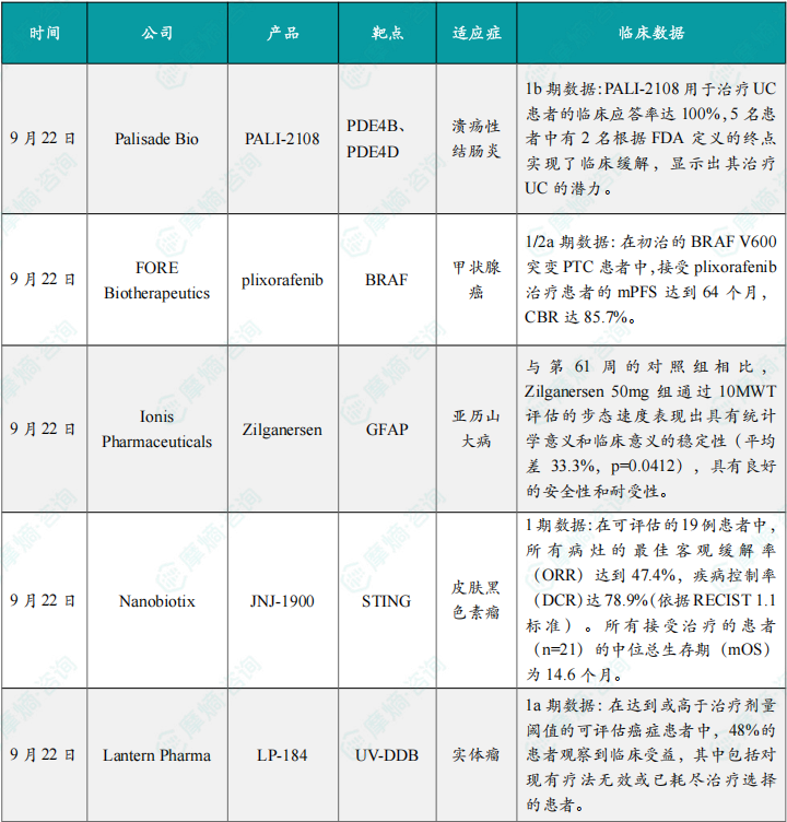 9月22日,Lantern Pharma公司宣布,其在研疗法LP-184的1a期临床试验达到了所有主要终点,显示出良好的安全性和PK特征,并观察到初步的抗肿瘤活性。目前患者入组已完成,部分患者因持续获得临床获益而继续接受治疗。LP-184是一种可穿透血脑屏障的小分子药物,通过“合成致死”机制靶向DNA损伤修复(DDR)缺陷肿瘤。