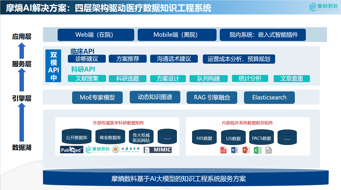 四层架构驱动的医疗数据知识工程系统:该系统采用分层架构设计,涵盖数据湖、引擎层、服务层和应用层。数据湖整合外部权威医学科研数据与内部临床系统数据,引擎层集成Mixture-of-Experts专家模型、动态知识图谱、RAG检索增强引擎和Elasticsearch搜索等核心技术,服务层提供临床API、科研API双模中台,便捷对接医院或企业系统;应用层实现 Web 端、Mobile端及院内系统智能插件多端覆盖,构建完整的数据处理与应用链条,深度挖掘医疗数据价值。
