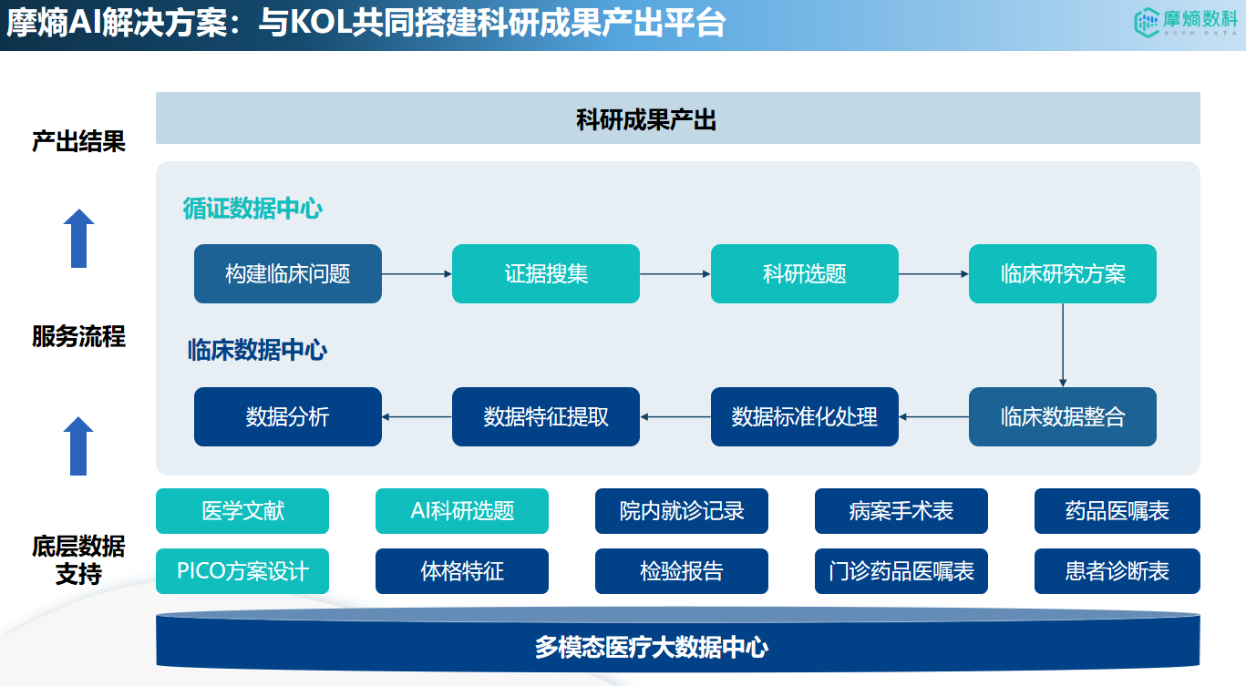 科研成果产出平台:与行业KOL合作搭建平台,将多模态医疗大数据与循证研究流程相结合,提供从临床问题构建、证据搜集、科研选题、研究方案设计到数据分析、结果产出的一站式服务,加速医药科研成果的转化。