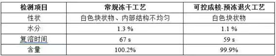 从冻干周期来看,可控成核工艺比常规冻干工艺延长了3 h,两种冻干工艺所制得产品的外观、水分及复溶时间无明显差异。