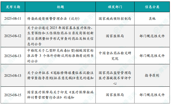 例如我们在分析最近一周(2025年8月11日至2025年8月17日)国内医药大健康行业政策的法规,只需通过在‘发布日期’筛选时间点击‘查询’即可查阅最新法规情况,详细解读分析可通过其周期性的医药行业观察报告了解,内容如下。