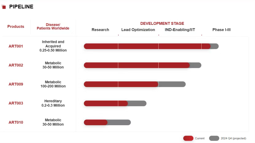 核心管线适应症为转甲状腺素蛋白淀粉样变性(ATTR)的ART001,目前中国NMPA批准I/IIa期,美国FDA批准I期。另一款核心产品为ART002,严重杂合子家族性高胆固醇血症(HeFH)也进入临床阶段。