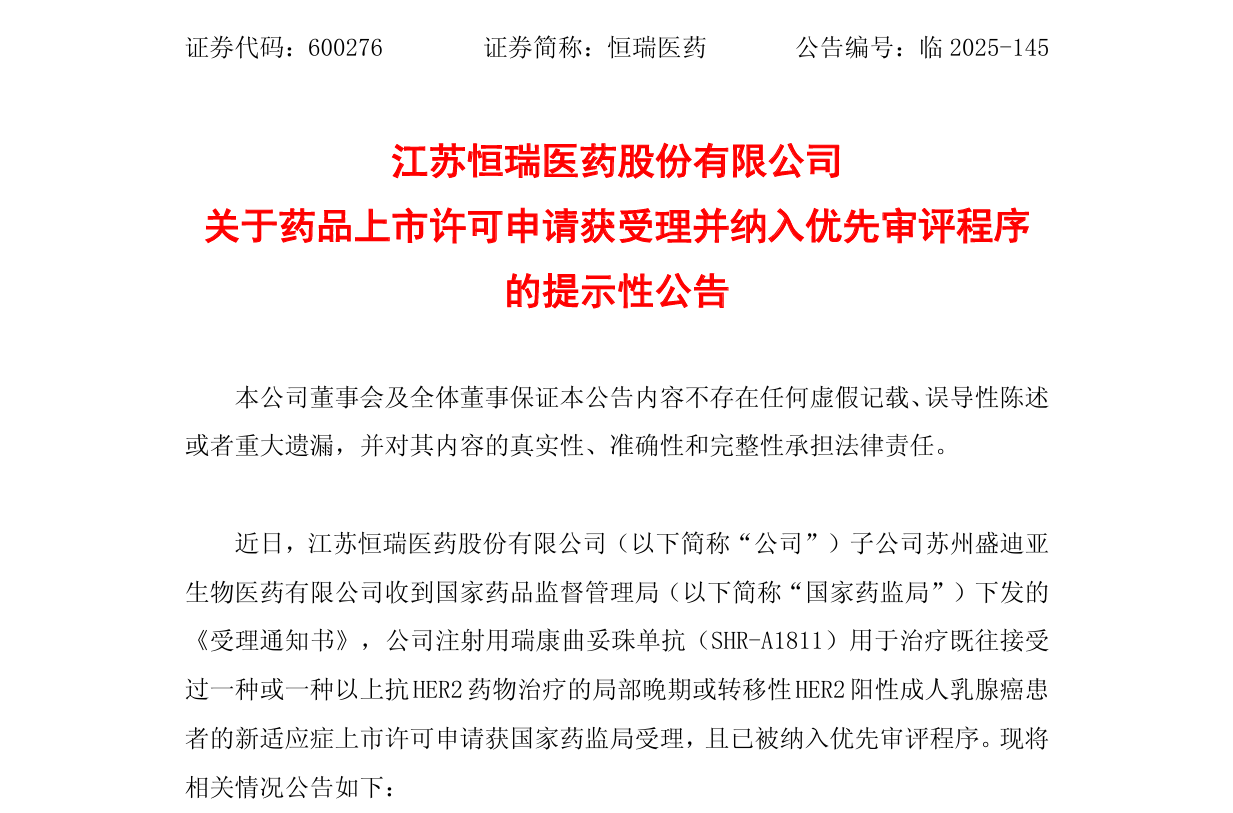 9月18日,恒瑞医药公告称,其子公司苏州盛迪亚生物医药收到国家药监局《受理通知书》,该公司的注射用瑞康曲妥珠单抗(SHR-A1811)上市许可申请已获受理,并被纳入优先审评程序。该药物此次申报的适应症为:针对既往接受过一种或多种抗HER2药物治疗的局部晚期或转移性HER2阳性成人乳腺癌患者。