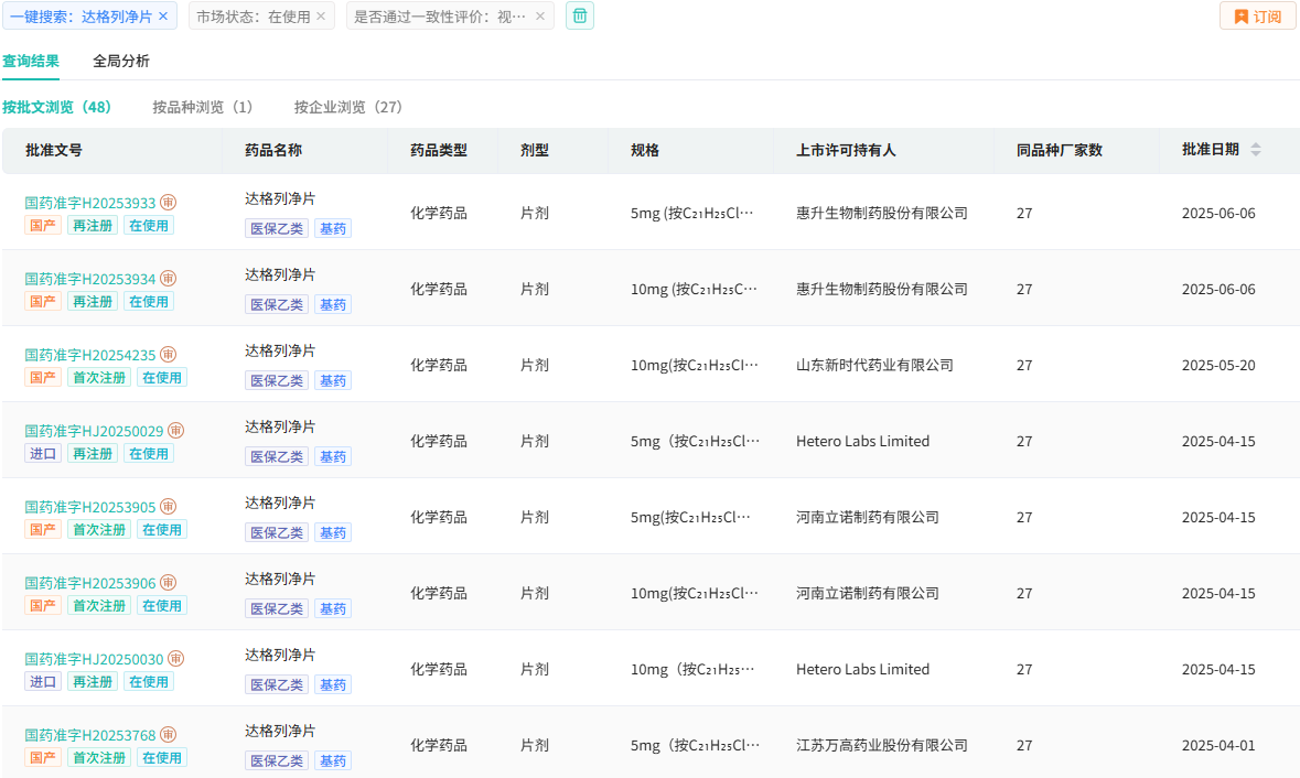 一是仿制药适应症少于原研药的5个品种:包括达格列净片、艾曲泊帕乙醇胺片等。