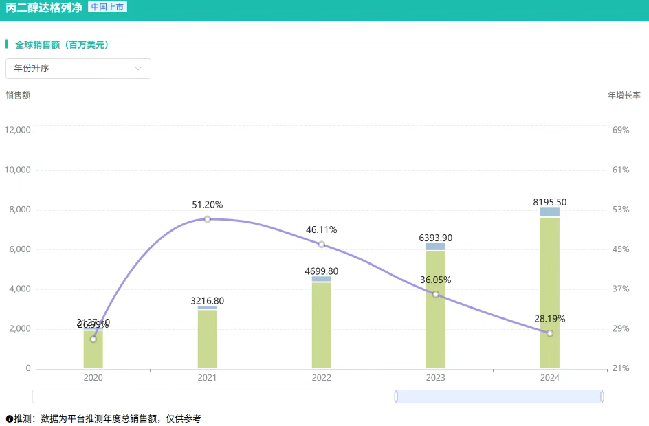 据摩熵医药销售数据,2023年达格列净片全球销售额高达63.93亿美元,同比增36%。2024 年同比增长28.19%至81.95亿美元。