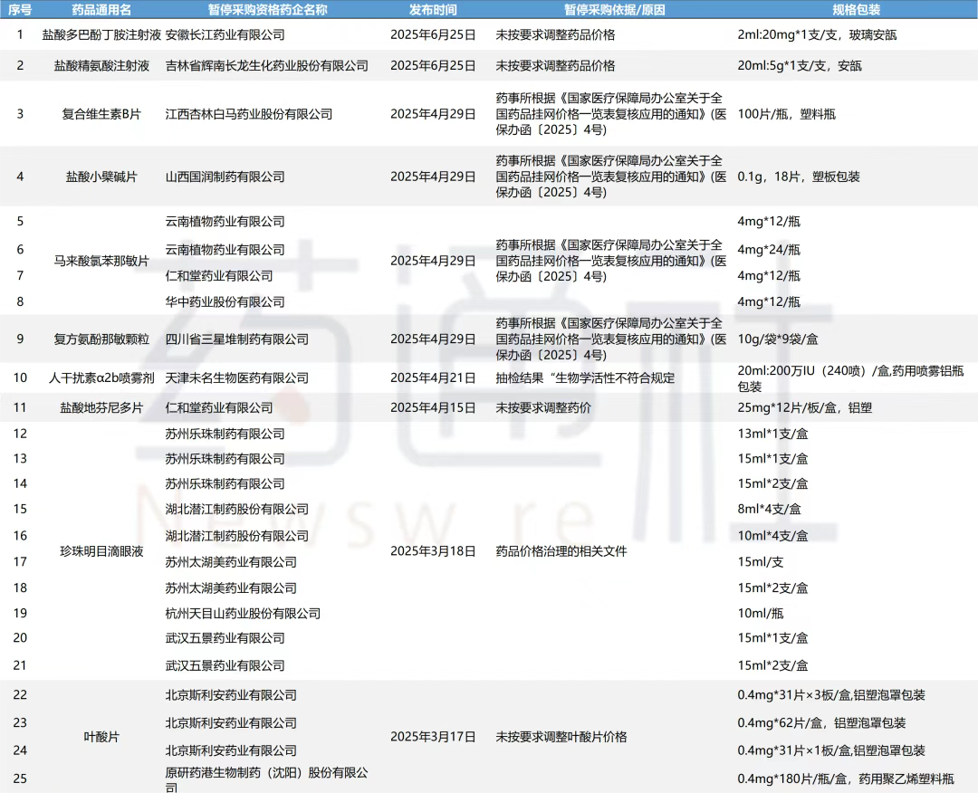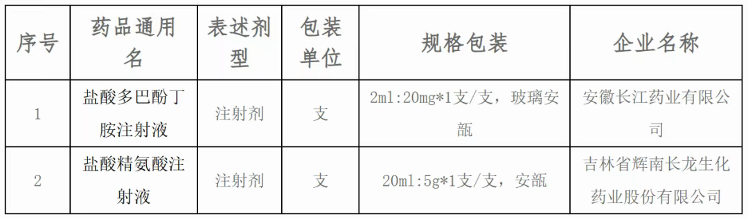 最新一批为6月25日,安徽长江药业有限公司生产的盐酸多巴酚丁胺注射液(2ml:20mg*1支/支,玻璃安瓿)、吉林省辉南长龙生化药业股份有限公司生产的盐酸精氨酸注射液(20ml:5g*1支/支,安瓿)因未按要求调整药品价格而被暂停采购资格。