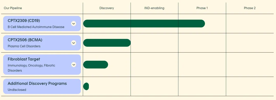 Capstan Therapeutics聚焦于自身免疫性疾病、肿瘤和纤维化领域。其主打候选疗法为 CPTX2309,这是一种靶向脂质纳米颗粒(tLNP),可将编码抗 CD19 嵌合抗原受体(CAR)的 mRNA 递送至体内表达 CD8 的细胞毒性 T 细胞,用于治疗 B 细胞介导的自身免疫性疾病。
