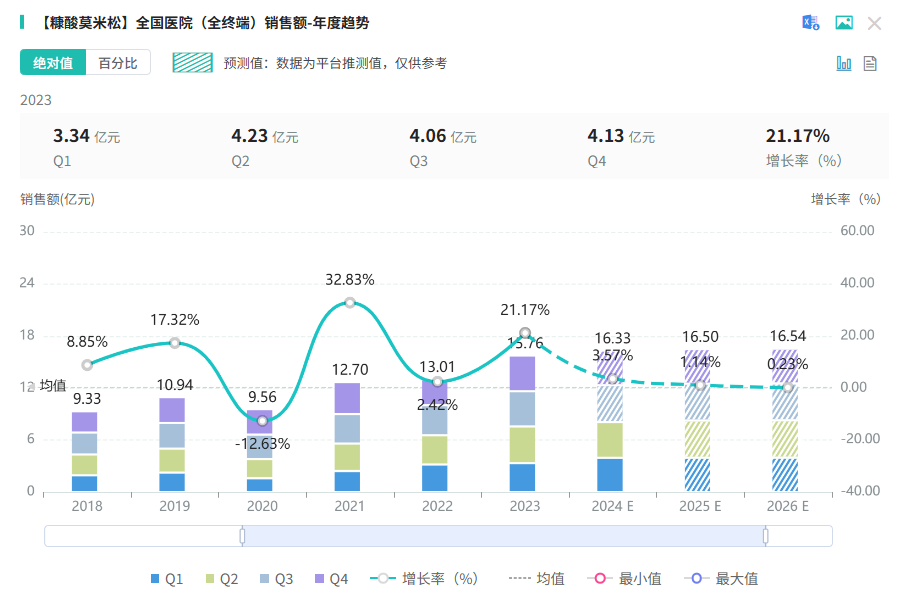 其中糠酸莫米松是由默沙东原研的局部高效抗炎药,作为鼻用制剂时,可适用于变应性鼻炎(季节性/常年性)、鼻息肉(术后预防复发)的治疗,而作为外用制剂时,可用于治疗中轻度特应性皮炎、银屑病(斑块型)、接触性皮炎、神经性皮炎。据摩熵医药全国医院(全终端)销售数据库显示,糠酸莫米松在近年来的销售额呈逐年上升趋势,2023年全国医院(全终端)销售额达15.76亿元,2024年销售额约达16.33亿元,增长率超3.5%,市场潜力巨大。