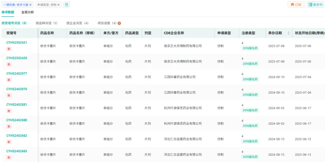 7月8日,CDE官网显示,南京正大天晴制药有限公司提交的4类仿制化药依伏卡塞片上市申请已获受理,若顺利获批,有望拿下该品种的首仿资格。