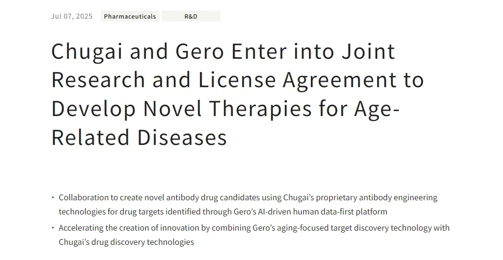 2025年7月7日,中外制药(Chugai,罗氏控股的日本公司)与新加坡生物技术公司Gero PTE. LTD.宣布,双方已达成联合研发和许可协议,以开发治疗衰老相关疾病的新型疗法。在此次合作中,中外制药将利用其专有的抗体工程技术,针对Gero公司通过其独特的人工智能靶点发现平台分析人体数据集发现的新药物靶点,开发新型抗体候选药物。