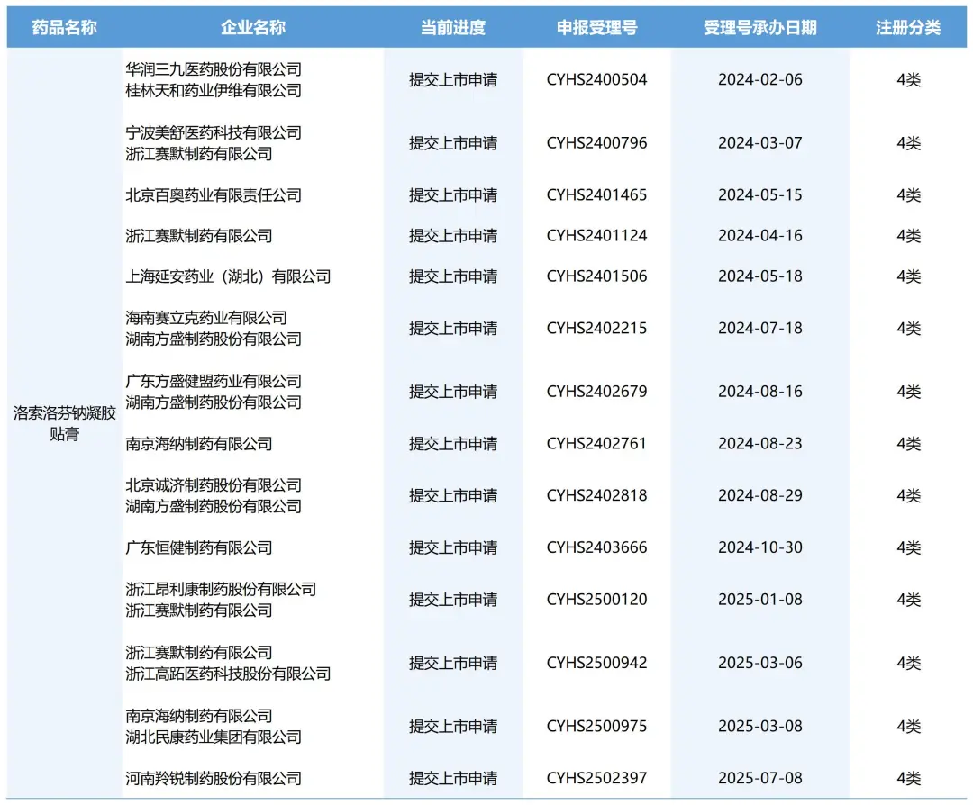 2025年7月9日,据CDE显示,洛索洛芬钠凝胶贴膏原研企业LEAD上市申请获受理,受理号为JXHS2500076。