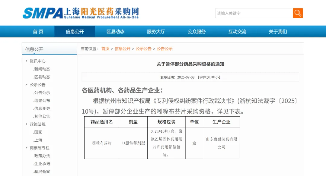 2025年7月8日,上海阳光医药采购网最新公示,根据杭州市知识产权局《专利侵权纠纷案件行政裁决书》(浙杭知法裁字〔2025〕10号),暂停山东鲁盛制药有限公司生产的吲哚布芬片采购资格。