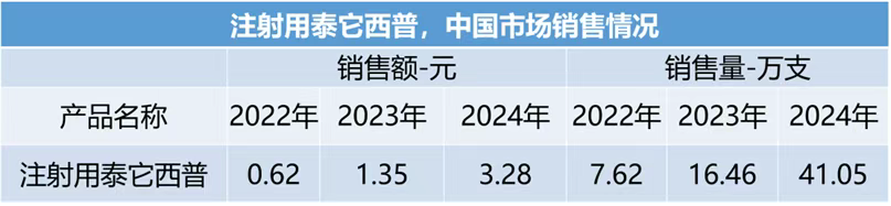 市场表现:2022-2024年院内销售额分别为2.28、3.92、4.82亿元,销售量分别是0.70、1.20和1.47万支。