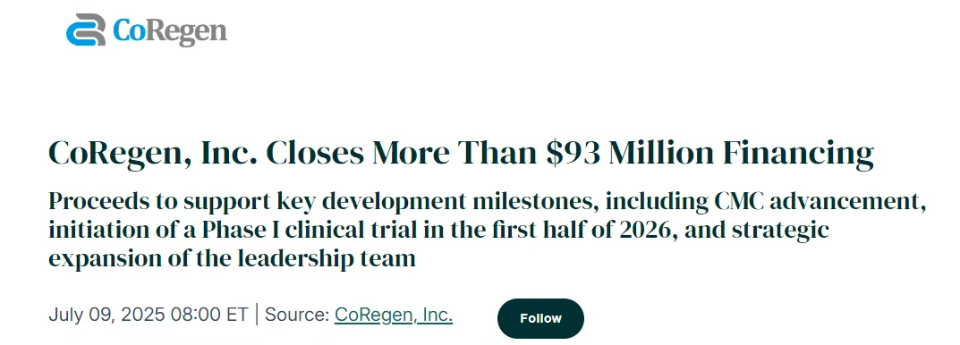 2025年7月9日,临床阶段的基因治疗生物技术公司CoRegen宣布完成9339万美元(约6.7亿元,按汇率1 美元≈7.1764人民币)的融资,此次融资是通过私募方式向少数投资者进行的。