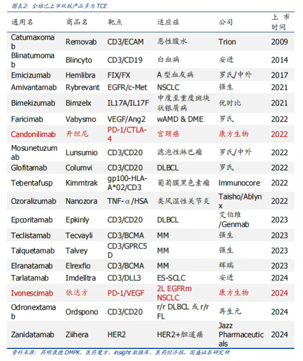 目前全球上市的双抗产品有将近20款,超过一半为 TCE 双抗,海外双抗获批适应症主要