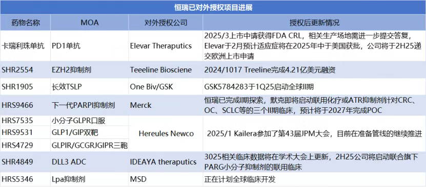以下是已对外授权项目的进展,已实现对外授权的管线全球进展顺利。