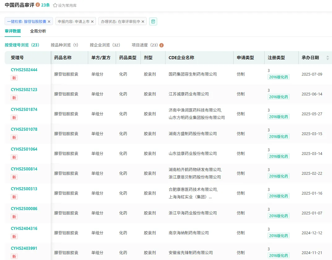 当前已有石药集团、山东鲁抗医药、湖南九典制药、杭州康恩贝制药、山东新华制药等23家药企获得腺苷钴胺胶囊生产批文。值得注意的是,仅今年就有15家企业密集获批,短期内获批数量占总量超六成,足见这一品种在市场中的关注度与企业布局的迫切性。