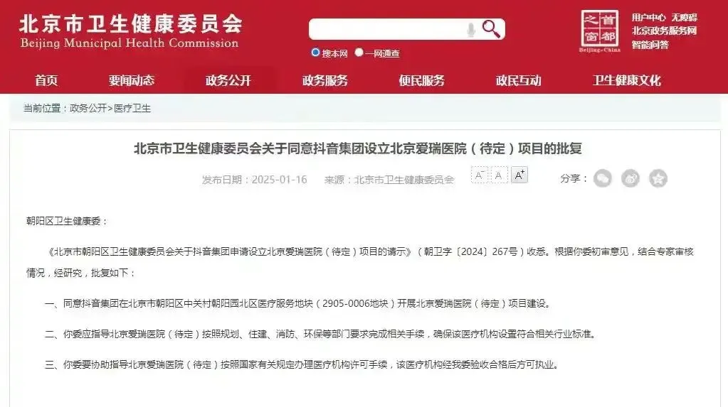 早在今年1月16日,北京市卫健委官网发布批复,同意抖音集团在朝阳区中关村朝阳园北区医疗服务地块(2905-0006地块)建设北京爱瑞医院(待定)。该项目为三级综合中外合资合作营利性医院,床位数为800张。