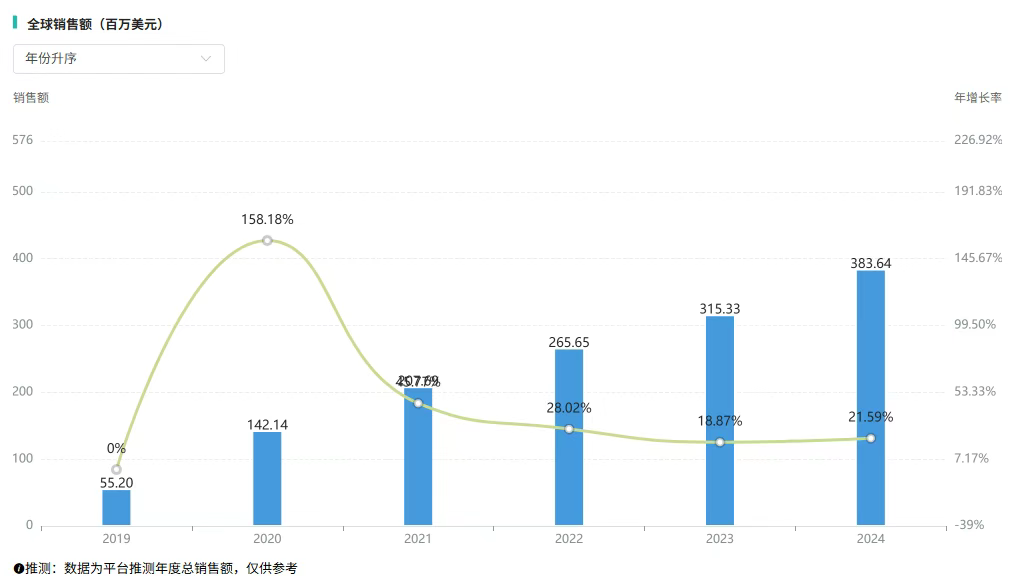 据摩熵医药数据库显示,自上市以来,苯磺酸美洛加巴林片在全球的销售额持续飙涨,2019-2023年累计销售达1429亿日元(即时汇率换算约10亿美元),2024年全球销售额近4亿美元,同比增长达21.59%。