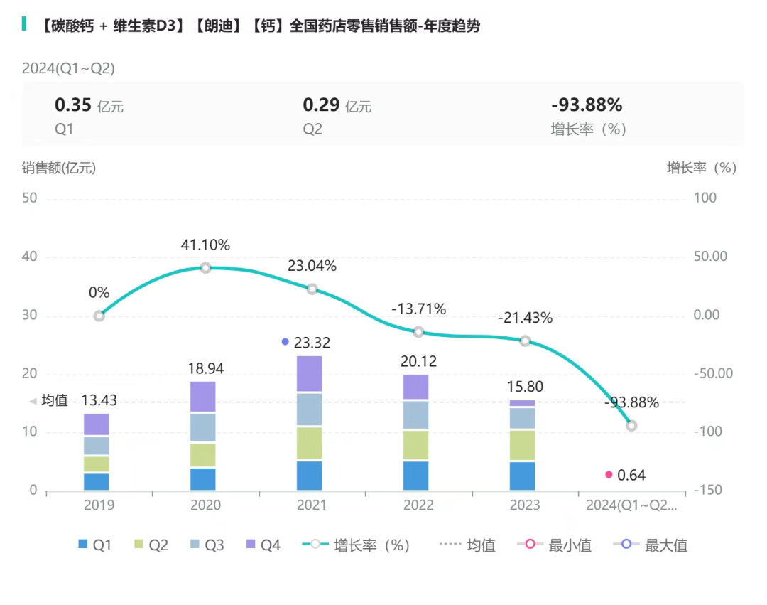 到了2024年上半年,朗迪钙销量同比下滑 94.4%,预计全年销售额难破1个亿,排名几乎跌出前十。