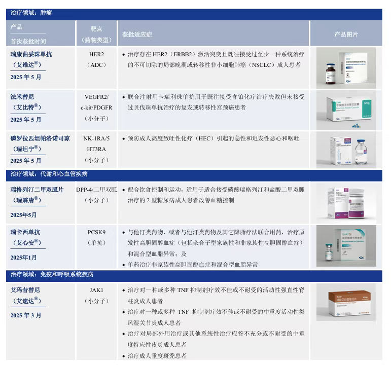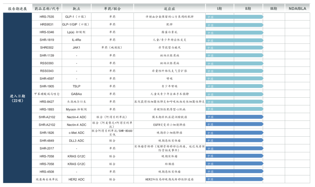 报告期内,公司有15个自主研发的创新分子首次进入临床阶段, 药物类型包括小分子化药、抗体、ADC,涉及肿瘤、代谢和心血管疾病、免疫和呼吸系统疾病等多个疾病治疗领域,公司ADC平台已有10余个新型、具有差异化的ADC分子成功获批临床,其中瑞康曲妥珠单抗(SHR-A1811) 目前已有9项适应症被CDE纳入突破性治疗品种名单。