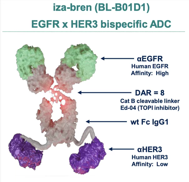 来自中国药企百利天恒的Iza-bren是全球首创(First-in-class)、新概念(New concept)且唯一进入 III 期临床阶段的 EGFR×HER3 双抗 ADC,Iza-bren 正在中国和美国进行 40 余项针对多种肿瘤类型的临床试验。截至目前,Iza-bren 另有 5 项适应症被国家药品监督管理局药品审评中心纳入突破性治疗品种名单。