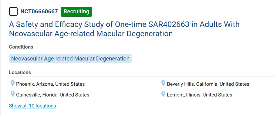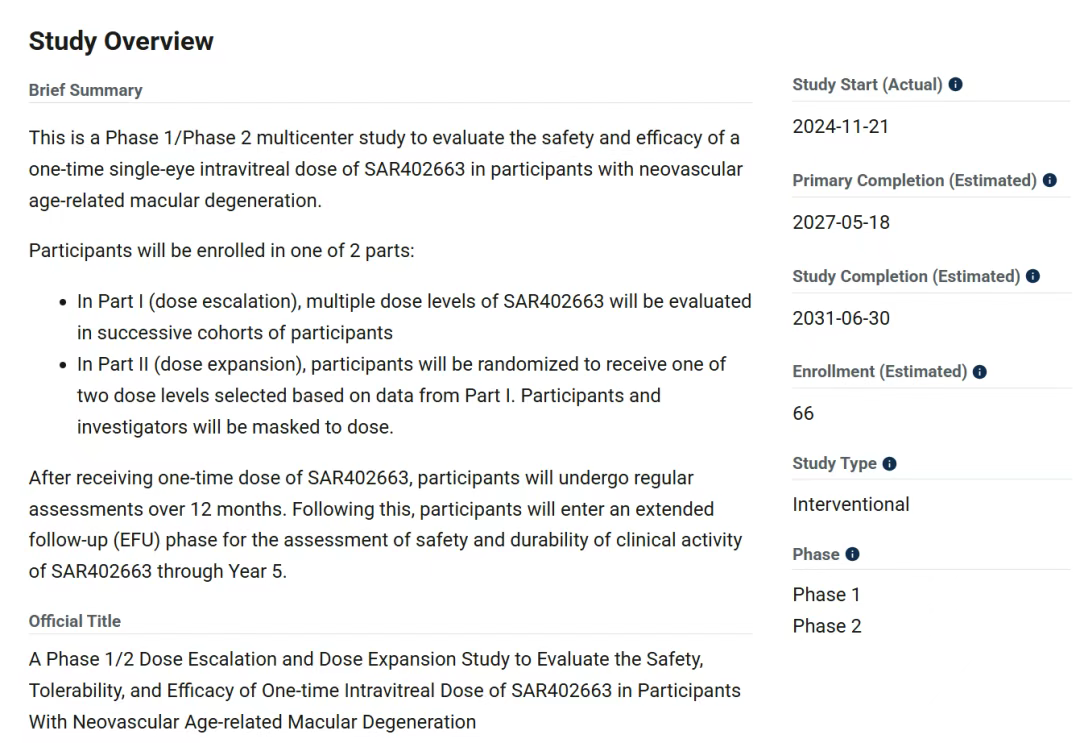 据赛诺菲官网信息,SAR402663为一次治疗的AAV-sFLT01基因疗法,计划用于nAMD,目前处于1/2期临床研究(NCT06660667)中,预计2031年6月完成。