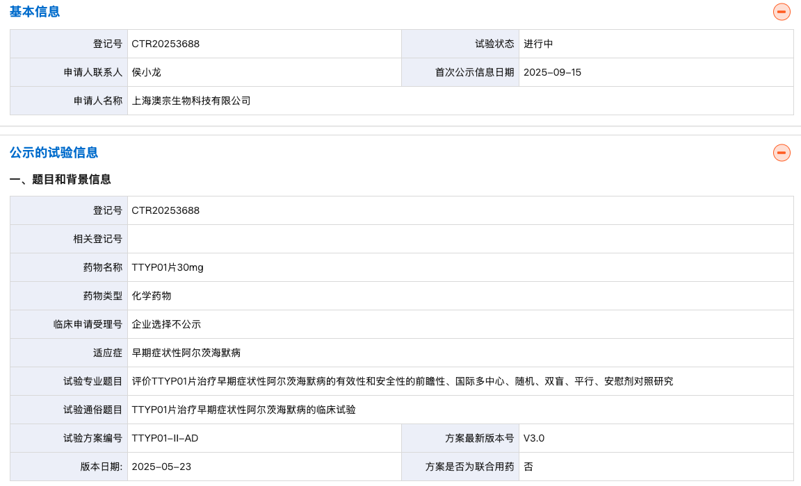 9月15日,药物临床试验登记与信息公示平台官网显示,澳宗生物登记了一项评价 TTYP01片(依达拉奉片)治疗早期症状性阿尔茨海默病(AD)的有效性和安全性的前瞻性、国际多中心、随机、双盲、平行、安慰剂对照的 II 期临床研究。