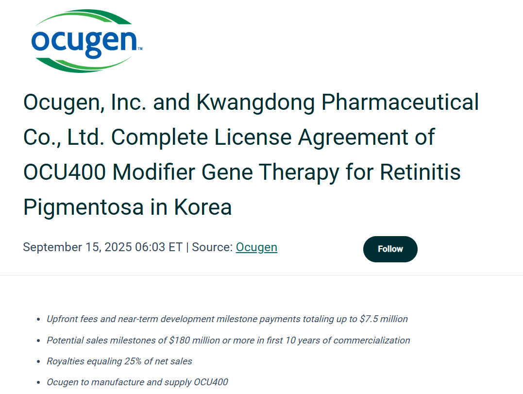 2025年9月15日,Ocugen宣布与韩国领先制药企业Kwangdong Pharmaceutical签署许可协议,授予后者针对视网膜色素变性(RP)的新型修饰基因疗法 OCU400 在韩国的独家权益。