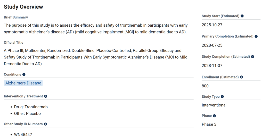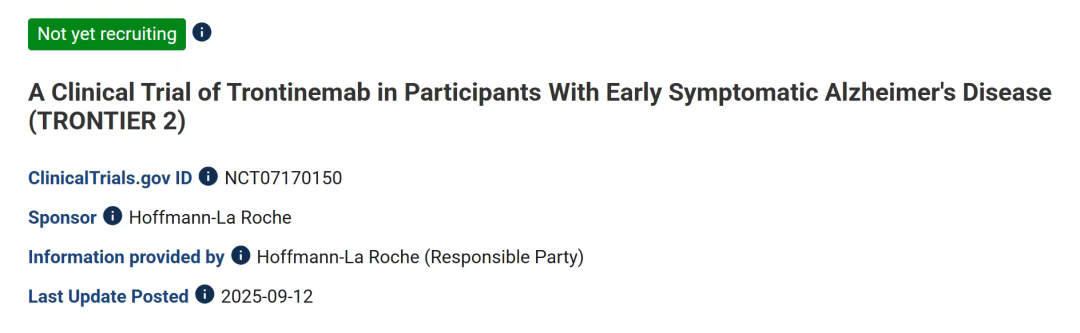 近日(20250912),罗氏在clinical trials网站上,登记了一项关于Aβ抗体药物trontinemab(anti-Aβ/TfR1),在早期症状阿尔茨海默病受试者中,启动两项三期临床试验NCT07169578和NCT07170150的研究信息,这两项临床都预计于10月27日启动,分别入组人数为800例,这也意味着该药物迈入临床阶段的最后时刻,距离上市已经不远。