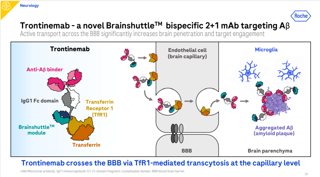 Trontinemab是罗氏开发的新型重磅Aβ抗体药物,其除了采用独特的Aβ抗原表位,同时采用了Brainshuttle技术,通过偶联能结合Transferrin Receptor转铁蛋白受体的模块,得以大幅提高穿透血脑屏障(BBB)的能力,提高到达脑部的分布能力。