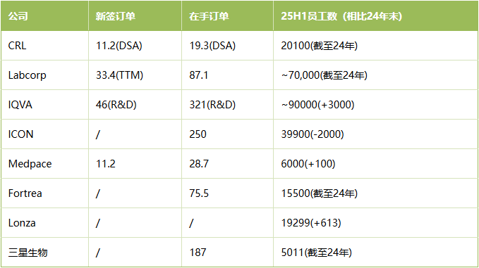 Labcorp、IQVIA、Medpace、Lonza和三星生物的员工数较前期有所增长,CRL、ICON及Fortrea有小幅减员。