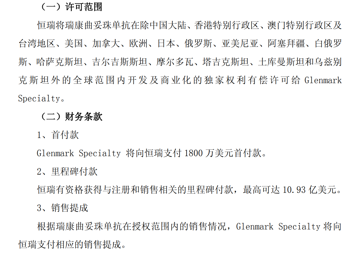 根据协议,恒瑞将瑞康曲妥珠单抗在除中国大陆、香港特别行政区、澳门特别行政区及台湾地区、美国、加拿大、欧洲、日本、俄罗斯、亚美尼亚、阿塞拜疆、白俄罗斯、哈萨克斯坦、吉尔吉斯斯坦、摩尔多瓦、塔吉克斯坦、土库曼斯坦和乌兹别克 斯坦外的全球范围内开发及商业化的独家权利有偿许可给Glenmark Specialty。