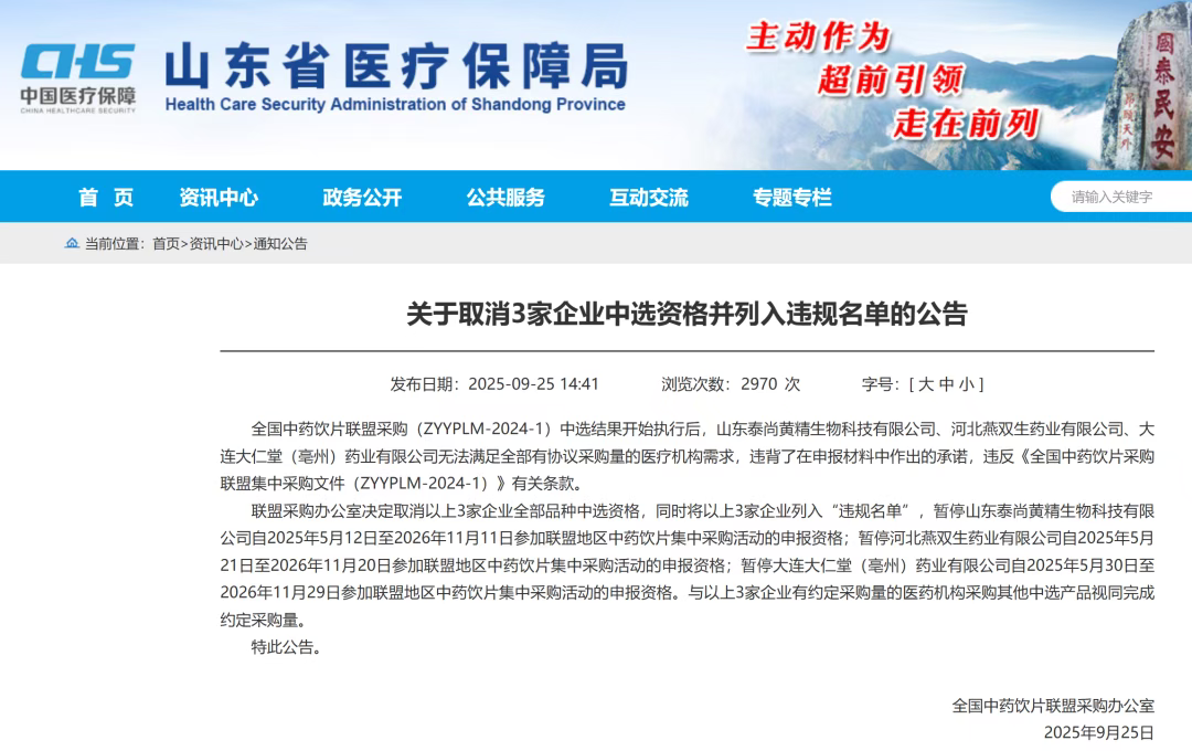9月25日,全国中药饮片联盟采购办公室发布公告,山东泰尚黄精生物科技有限公司、河北燕双生药业有限公司、大连大仁堂(亳州)药业有限公司因无法保障医疗机构用药需求,被取消全部品种中选资格,列入“违规名单”,并暂停参与联盟地区集采活动18个月。