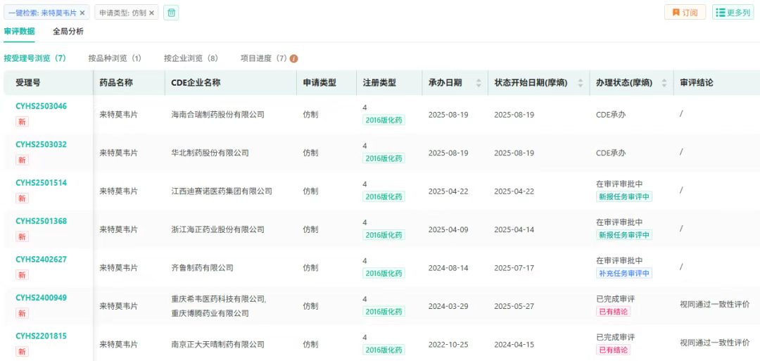 8月19日,CDE官网显示,海南合瑞制药和华北制药递交了4类仿制化药来特莫韦片的上市申请,均获受理。据摩熵医药数据库信息,来特莫韦2024年全球销售额约8亿美元,该剂型国产第三家的席位正在激烈争夺中。