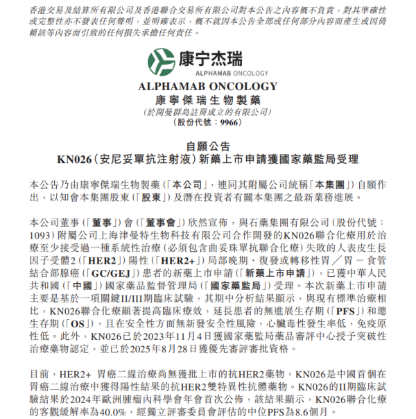 KN026的研发始于康宁杰瑞的实验室,2021年8月,石药集团以10亿元总金额引进KN026的中国权益,双方开启合作研发。此后,KN026的研发进程加速推进:2024年欧洲肿瘤内科学会(ESMO)大会上,II期临床试验结果首次公布,验证了其疗效与安全性;2025年9月7日,基于关键II/III期临床试验(KC-WISE)的期中分析结果,石药集团向国家药监局递交新药上市申请;2025年9月11日,上市申请正式获得受理。